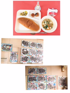 [2-1]教室には「せかいにいっぴきだけの魚」が飾られていました。雄大に泳ぐいっぴきの魚の周りに、カラフルな海の生き物が描かれていて、楽しくて素敵!まるで海の中にいるような気分になりました!