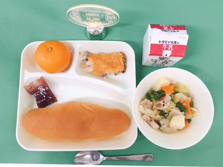 【鶏肉とじゃがいものスープ煮、きのこのドリア、みかん、コッペパン、いちごジャム、牛乳】
