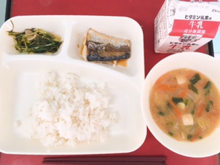 【ごはん、さごしのしょうゆだれかけ、みそ汁、みずなの煮びたし、牛乳】