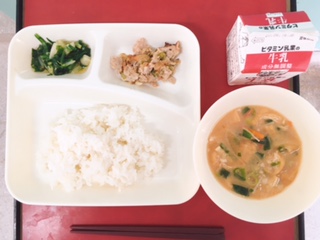 【ごはん、豚肉のごまだれ焼き、みそ汁、きくなとはくさいのおひたし、牛乳】