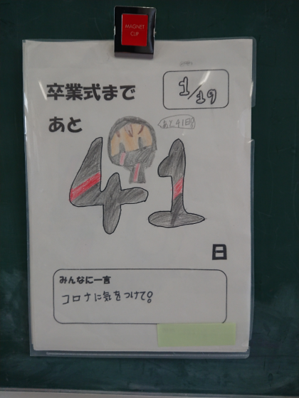 本日の1月19日から卒業式の3月19日まで、6年生が登校する日数(土日祝を数えない)は、あと41日です。