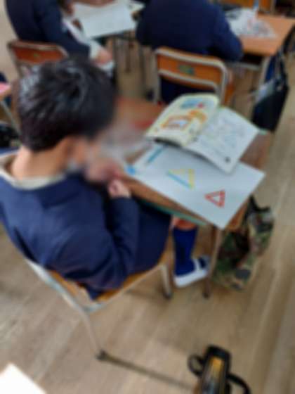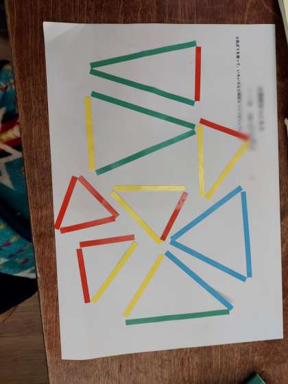 算数科では三角形についての学習をしています。4種類の棒を使って、様々な大きさの三角形を作ります。作ったものは、辺の長さが3本とも同じもの、2本の辺の長さが同じもの、辺の長さがバラバラのものに分類しました。どの子も楽しく取り組むことができていました。これからさらに学習を深めていきます。
