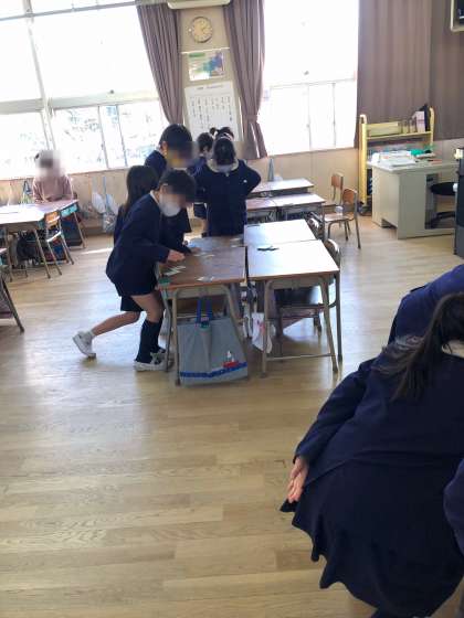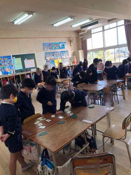 国語科の「おばあちゃんに聞いたよ」でいろはうた、いろはかるたを学習しました。そこで、かるた大会をすることにしました。たくさん取る子、あまり取れない子もいましたが終わった後、みんな「めっちゃ楽しかった。」と言っていました。