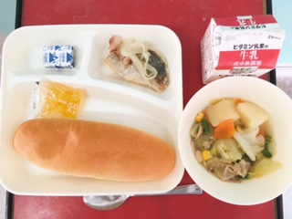 【あじのレモンマリネ、てぼ豆のスープ煮、固形チーズ、コッペパン、マーマレード、牛乳】