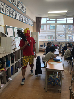 虎のパンツに真っ赤な体、金棒を持った鬼が、梅香小学校にやってきました。