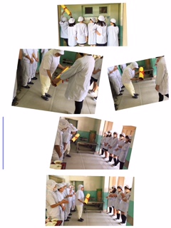 給食室前で調理員さんを待ち構えます。給食室からでてきた調理員さん達は、びっくりです!!