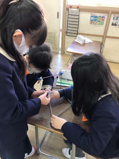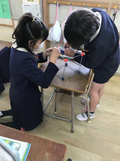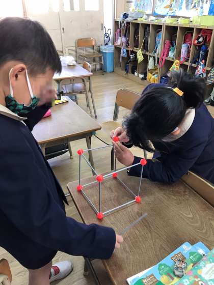 「はこのかたち」の学習で、ひごと玉を使ってはこの形を作りました。友だちと協力して作りました。