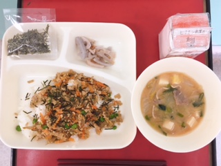 【鶏ごぼうご飯、みそ汁、焼きれんこん、牛乳】