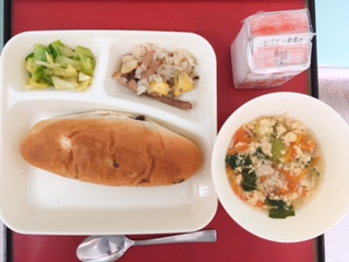 【中華おこわ、卵スープ、キャベツとピーマンのいためもの、レーズンパン、牛乳】