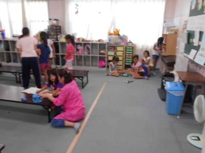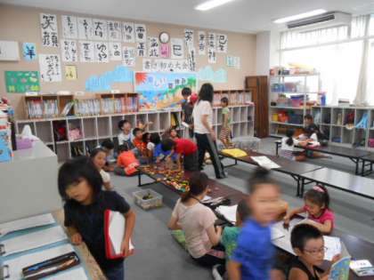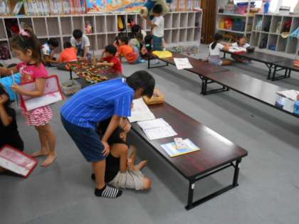プール開放が終わっても、いきいき活動は行っています。今日も40人近い子どもたちが朝から参加しています。夏休みの宿題をしたり、指導員の先生と一緒にゲームをしたりするなど楽しく活動しています。
