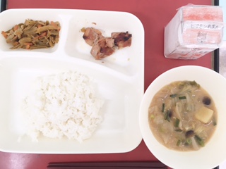 【ごはん、鶏肉のてり焼き、さつまいものみそ汁、きんぴらごぼう、牛乳】