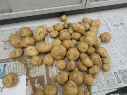 どこの学年もつかわなかった、ジャガイモの種イモを5月に管理作業員が秘かに植えておきました。夏休みになって、学習園を整備していると、ジャガイモが採れるわ、採れるわ。