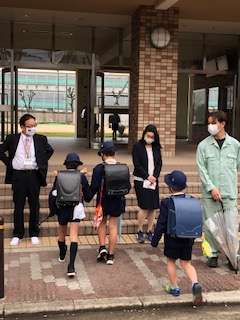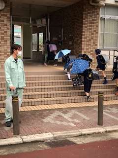 おはようございます。4月13日(火)、雨が降ったりやんだりややこしい天気の中での登校でした。子どもたちも、傘をさしている子もいればさしていない子もいました。