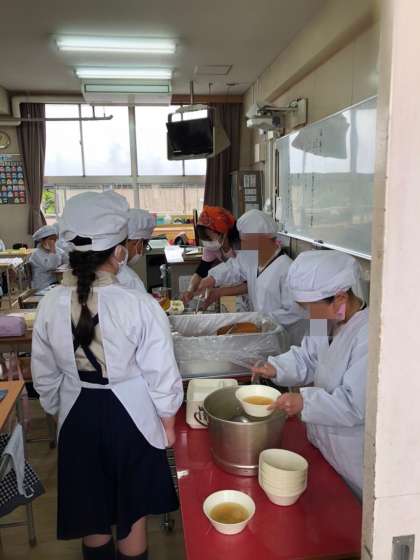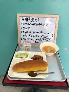 今日の献立は、豚肉のデミグラスソース、スープ、キャベツとコーンのソテー、パンプキンパン、牛乳です。自分たちで配膳していただきます。