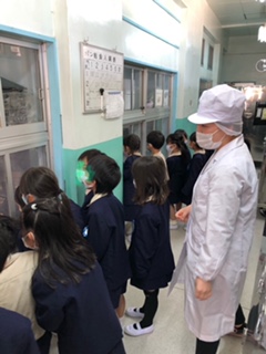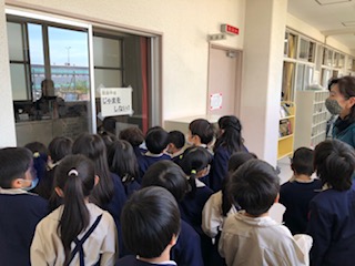 1年生が「学校たんけん」で校内のいろいろなところを探検しました。2〜6年生の教室を回って学習している様子を見たり、給食室で調理員さんが給食を作っているところをのぞかせてもらったりしていました。