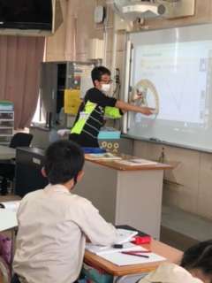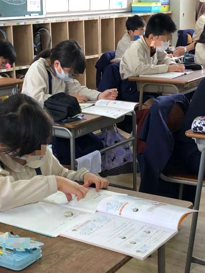 4年生の算数です。分度器を使って角度を測る学習です。分度器をどうあてたらいいのか先生が黒板にする見本をよく見て練習していました。