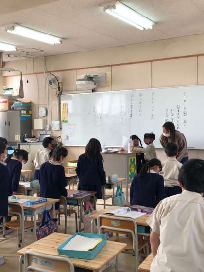 2−1の朝の会の様子です。日直さんが前に立って、挨拶をしました。そのあと、健康観察をしていました。