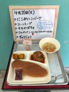 今日の献立は、煮込みハンバーグ、コーンスープ、焼きカボチャ、コッペパン、イチゴジャム、牛乳です。いただきます。