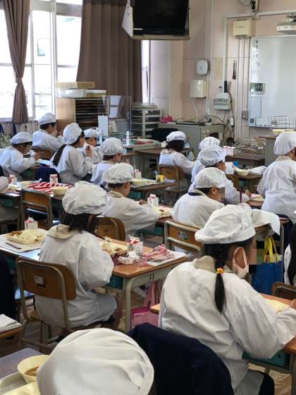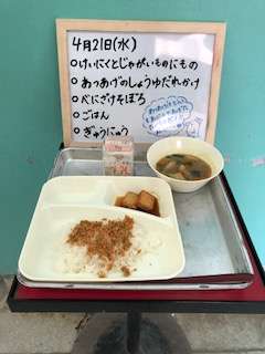 今日の献立は、鶏肉とジャガイモの煮物、あつあげのしょうゆだれかけ、ベニザケそぼろ、ごはん、牛乳です。給食中は飛沫飛散を避けるため、みんなで前を向いて静かに食べます。