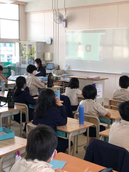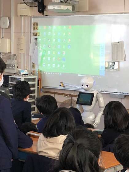 水曜日は、掃除を簡易にして10分間の英語モジュール学習をしています。映像教材を使って発音練習をしたり英文を聴いたりしています。ペッパーさんも活躍しています。