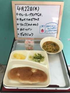 今日の献立は、カレースパゲッティ、キャベツのピクルス、リンゴ(カット缶)、おさつパン、牛乳です。いただきます。
