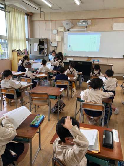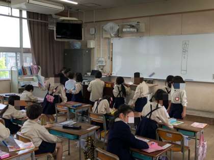 1年生は昨日から5時間目の学習をしています。今日は、2組とも来週からの緊急事態宣言が発出された場合の学習活動に備えてしっかり連絡帳を書いていました。まだ全部は書けないので、先生がカードを作ってそれぞれの連絡帳に貼っていきます。その順番待ちの列ができていました。