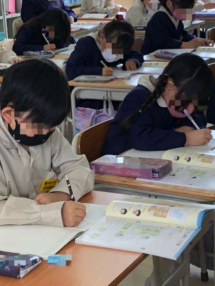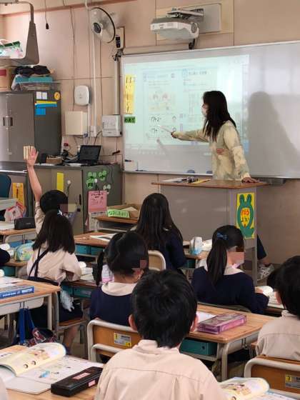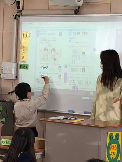 2年生の算数です。たし算の学習をしていました。提示された課題に1人1人がしっかり取り組み、自分の考えをみんなに発表し確かめます。