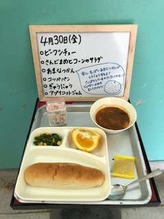 今日の献立は、ビーフシチュー、さんど豆とコーンのサラダ、甘夏かん、コッペパン、牛乳、アプリコットジャムです。いただきます。