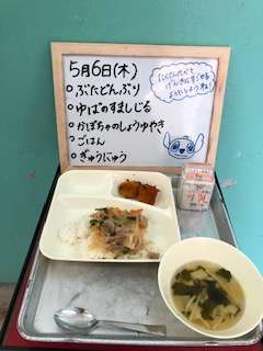 教に献立は、豚どんぶり、湯葉のすまし汁、カボチャのしょうゆ焼、牛乳です。いただきます。