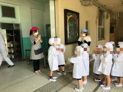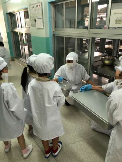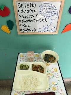 今日の献立は、ホイコーロー、中華スープ、キュウリのピリ辛和え、ごはん、牛乳です。1年生は自分たちで給食を運ぶのに随分慣れました。調理員さんも飯缶やおかず缶などをこぼさないよう優しく丁寧に渡してくれます。