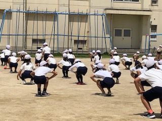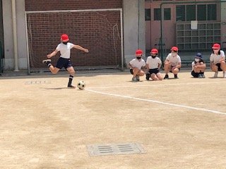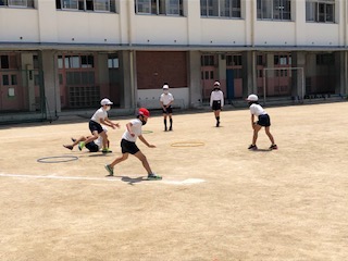 5年生の合同体育です。念入りな準備運動の後、キックベースをしていました。