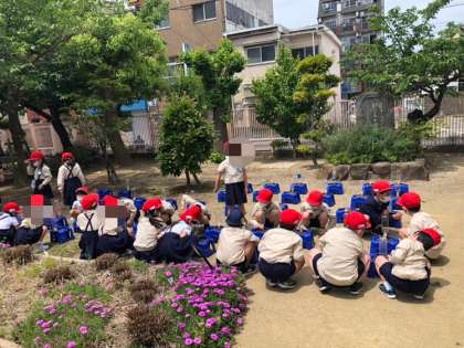1年生が昨日植えた朝顔の鉢に水をあげていました。そのあと、教室に戻って観察日記を書きました。