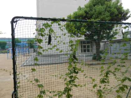 みどりのカーテンでゴーヤが所々で実っていますが、収穫しないので、赤く枯れた実ができています。もし、よろしければ学校に来てゴーヤを収穫してください。