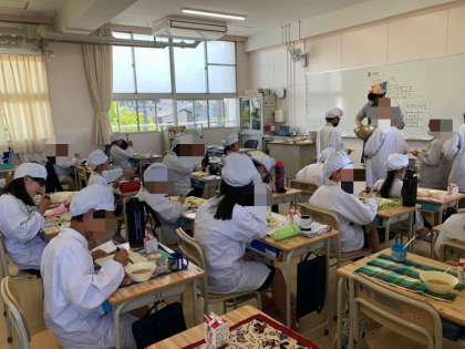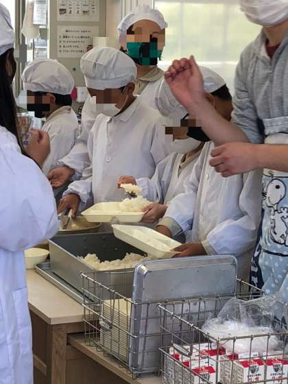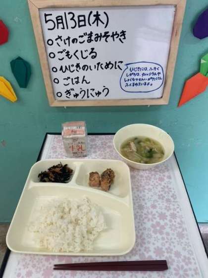今日の献立は、鮭のごまみそ焼き、五目汁、ひじきの炒め煮、ごはん、牛乳です。衛生に気を付けながら盛り付けして、いただきます。