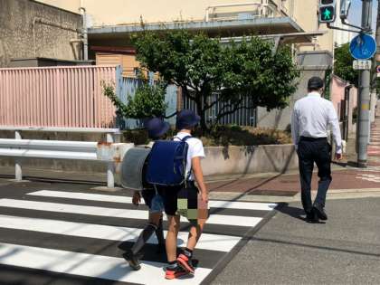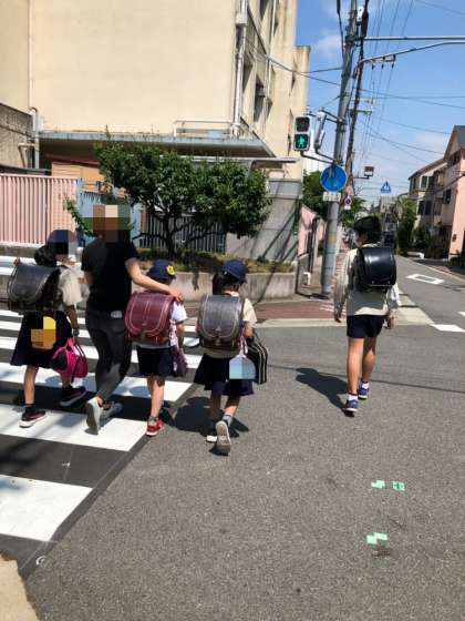 預かり児童以外の児童が登校してきました。今日は、学校の南側の交差点のところで登校を見守っていました。もちろんですが、みんな、信号をちゃんと守ってわたっています。左右の確認をしている子もいました。