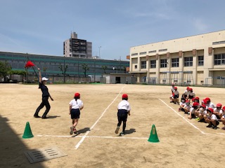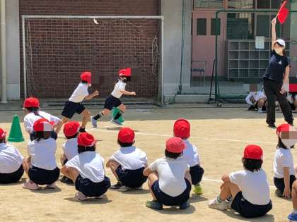 1年生の合同体育の様子です。50m走のタイムを計っていました。順番を待っている子は、走っている子をしっかり応援していました。