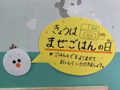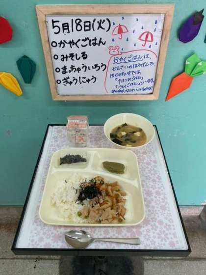 今日の献立は、かやくごはん、みそ汁、抹茶ういろう、牛乳です。よくまぜていただきました。