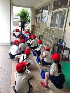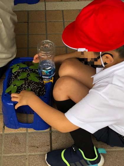 1−1の生活科の様子です。アサガオの成長の様子を観察していました。葉の形や大きさ、触った感触などいろいろなことを調べていました。後で、観察日記に記録するそうです。