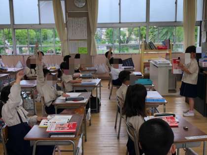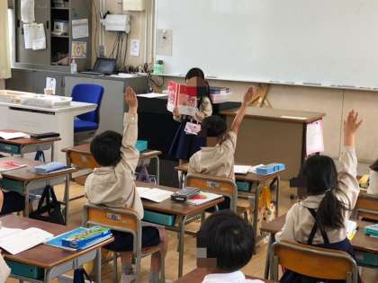 1年生の国語です。自分が見つけたものを発表します。学級のみんなは、発表者にいろいろ質問してそれが何かを当てていました。