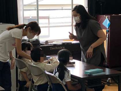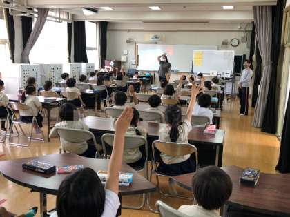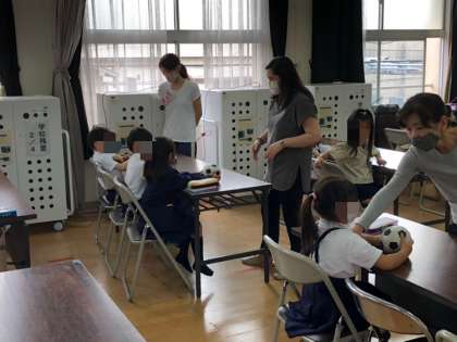 1年生の英語活動の様子です。1・2年生は外部から講師を招いて英語に親しむ取り組みをしています。ボールがまわってきた子は自己紹介をします。「マイネームイズ〇〇」とすっと出てくる子となかなか出てこない子がいます。これから少しずつ慣れていって楽しい活動にしましょうね。