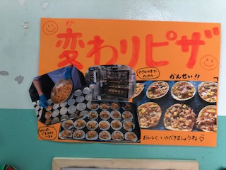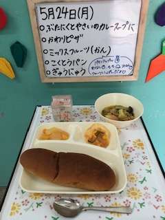 今日の献立は、豚肉と野菜のカレースープ煮、変わりピザ、ミックスフルーツ(缶)、黒糖パン、牛乳です。いただきます。