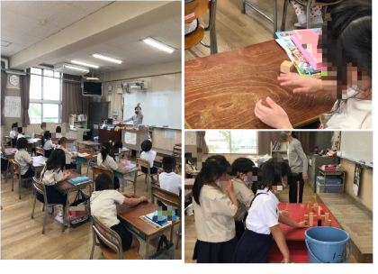 1年生の算数で「形」の学習です。積み木を使っていろいろな形を特徴によって仲間分けをしていました。