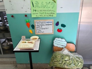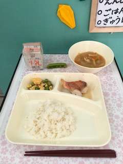 今日の献立は、赤魚のしょうゆつけだれかけ、みそ汁、えんどうの卵とじ、ごはん、牛乳です。これだけのさやからえんどう豆を取って調理してくれたんですね、調理員さん、ありがとうございます。(聞くところによると春日出中学校の給食分としてもう一袋分えんどうの豆を取ったそうです。本当にお疲れさまでした。)