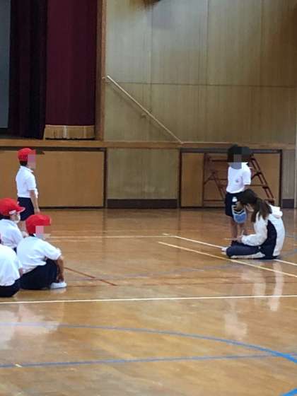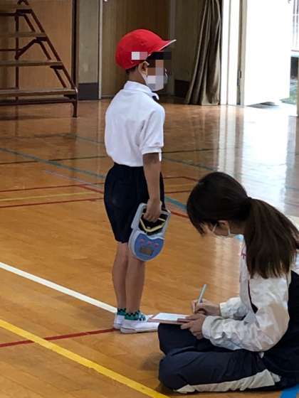 1年生の体育です。「新体力テスト」の種目の一つ「握力」の記録をとっています。右手と左手両方とも計ります。