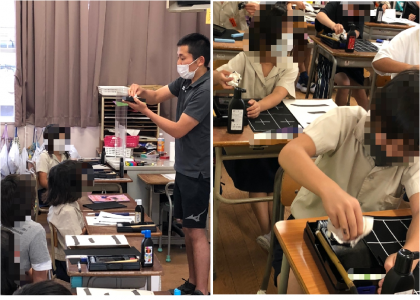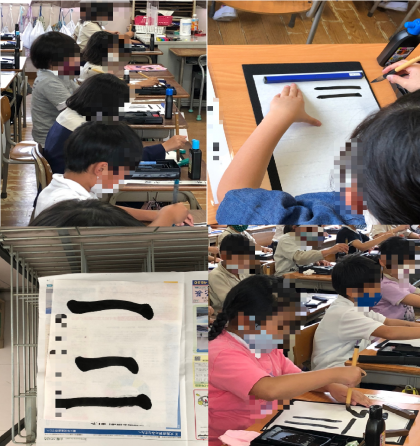 3年生の書写です。初めて毛筆を使っての書写をしました。ほとんどが未経験者なので、道具の名称や机上の配置、筆の持ち方、墨の付け方など書く前のことから運筆の仕方まで丁寧に指導しました。これから長く学習していく毛筆書道の入り口として大切な学習でした。もちろん後片付けの方法もしっかり指導しています。