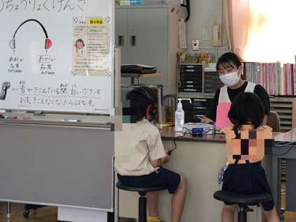 今日は1・2年生が聴力検査を受けました。1年生の様子です。検査の仕方をしっかり聞いてから臨んでいました。
