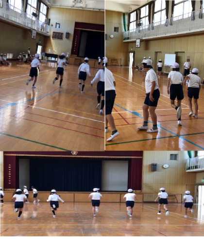 6年生の体育です。「新体力テスト」の書目の一つである「20mシャトルラン」の記録をとっていました。20mの距離を音楽リズムに合わせて何回も往復してその回数を記録します。みんな「ハァハァ」と息を切らしながら頑張っていました。