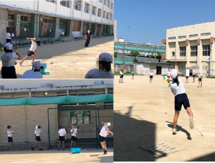 5年生の体育です。「新体力テスト」の「ソフトボール投げ」の練習をしていました。なかなかいいフォームですね。