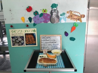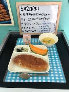 今日の献立は、かぼちゃのクリームシチュー、ミックス海藻サラダ、クインシーメロン、おさつパン、牛乳です。しっかり食べましょう。