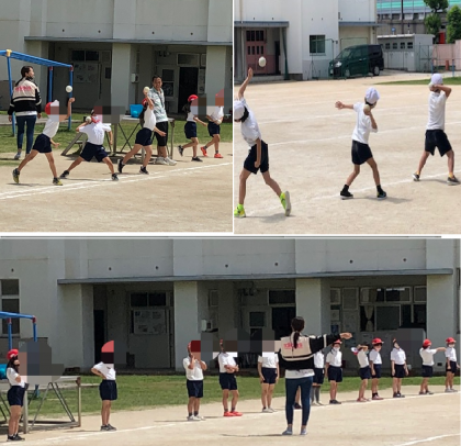 2年生の体育です。2年生も「新体力テスト」にむけてソフトボール投げの練習をしていました。西校舎の方向に向かって投げていたのですが、距離が出る放物線に投げられるように「校舎の3階をめがけて投げるんやで。」と具体物を目標にして説明していました。